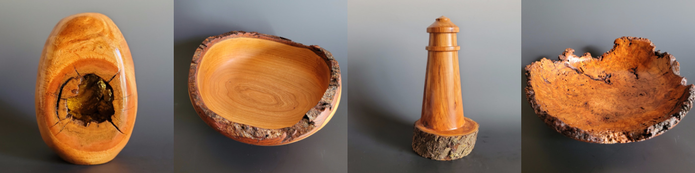 A lighthouse turned from applewood with live edge base to resemble a rustic coastline.